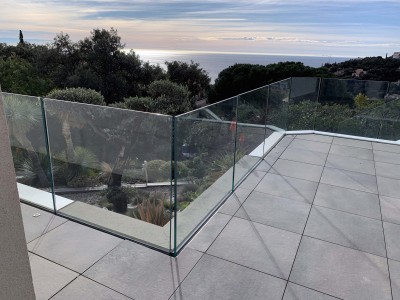 Finition: Garde corps en verre feuilleté, support en aluminium, fixé au sol.